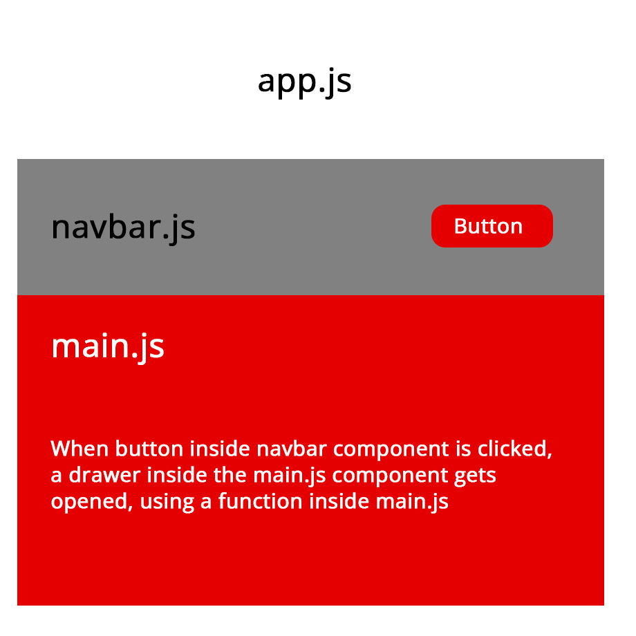 I`m trying to access a function inside main.js with a button in navbar.js so i can open a drawer which I have inside the main.js component.