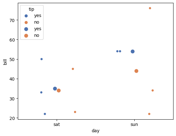 sns.stripplot(x='day', y='bill', data=df, jitter=True, hue='tip', palette='deep', dodge=True)