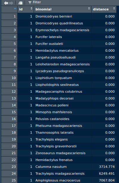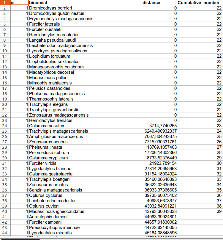 I would like to create a new column the includes the cumulative number of species based on the traveled distance. Here’s what the new column should look like.