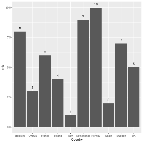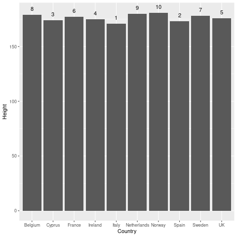 In this plot we crate the following layers: the barplot with rank as y coord and Coyntry name as x coord and text values of ranks. You can set ecact means instead inside aes(y=Height,...