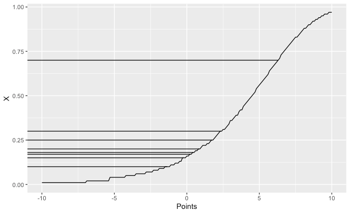df2<-data.frame(Points=seq(-10,10,by=.1),X=c(0.01, 0.01, 0.01, 0.01, 0.01, 0.01, 0.01, 0.01, 0.01, 0.01, 0.01, 0.01, 0.01, 0.01, 0.01, 0.01, 0.01, 0.01, 0.01, 0.01, 0.01, 0.01, 0.01, 0.01, 0.01, 0.01, 0.01, 0.01, 0.01, 0.01, 0.01, 0.02, 0.02, 0.02, 0.02, 0.02, 0.02, 0.02, 0.02, 0.02, 0.02, 0.02, 0.02, 0.02, 0.02, 0.02, 0.02, 0.04, 0.04, 0.04, 0.04, 0.04, 0.04, 0.04, 0.04, 0.04, 0.04, 0.04, 0.05, 0.05, 0.05, 0.05, 0.05, 0.05, 0.05, 0.06, 0.06, 0.06, 0.06, 0.06, 0.06, 0.06, 0.07, 0.07, 0.07, 0.07, 0.07, 0.08, 0.08, 0.08, 0.08, 0.09, 0.09, 0.09, 0.09, 0.1, 0.1, 0.1, 0.1, 0.11, 0.11, 0.11, 0.12, 0.12, 0.12, 0.13, 0.13, 0.15, 0.15, 0.15, 0.16, 0.16, 0.17, 0.17, 0.18, 0.18, 0.19, 0.19, 0.2, 0.2, 0.21, 0.22, 0.22, 0.22, 0.23, 0.23, 0.24, 0.25, 0.25, 0.26, 0.27, 0.28, 0.29, 0.3, 0.3, 0.31, 0.31, 0.32, 0.33, 0.34, 0.36, 0.36, 0.37, 0.38, 0.39, 0.39, 0.41, 0.42, 0.42, 0.44, 0.45, 0.46, 0.47, 0.48, 0.49, 0.5, 0.51, 0.52, 0.54, 0.55, 0.56, 0.57, 0.58, 0.59, 0.6, 0.61, 0.62, 0.64, 0.65, 0.66, 0.67, 0.68, 0.69, 0.7, 0.71, 0.73, 0.74, 0.75, 0.76, 0.77, 0.78, 0.79, 0.8, 0.81, 0.82, 0.83, 0.83, 0.84, 0.85, 0.86, 0.87, 0.88, 0.88, 0.89, 0.9, 0.9, 0.91, 0.92, 0.92, 0.93, 0.93, 0.94, 0.94, 0.95, 0.95, 0.96, 0.96, 0.96, 0.97, 0.97, 0.97))