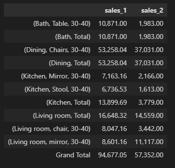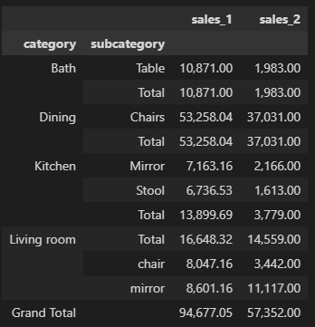 dd = df_from_dict.groupby(['category', 'subcategory'])[['sales_1', 'sales_2']].sum()