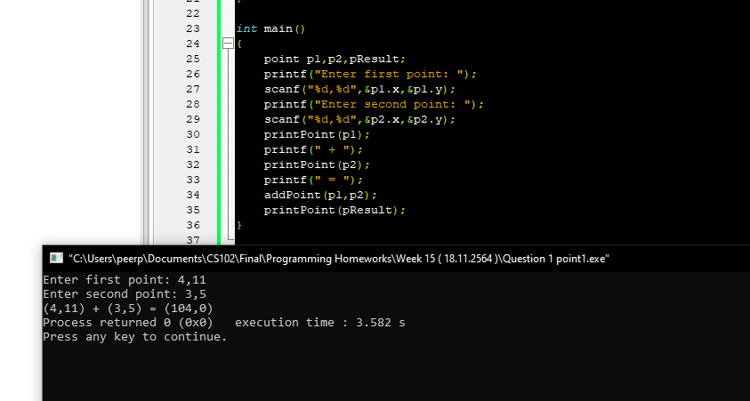 This is an unfinish code which I dont know what to do next ( Homework ). The question need me to add both points together into 1 point but I’m not sure what to do in int main() as the final step.