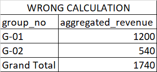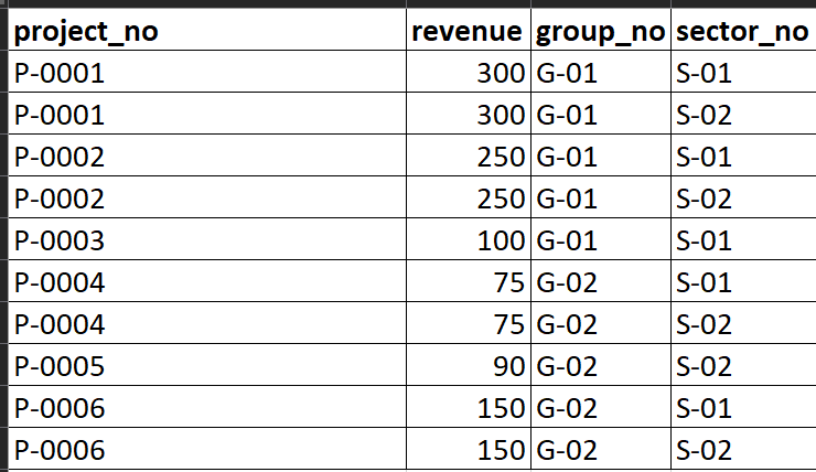 So, what I would like to get is total revenue by unique project_no on Groups (group_no).