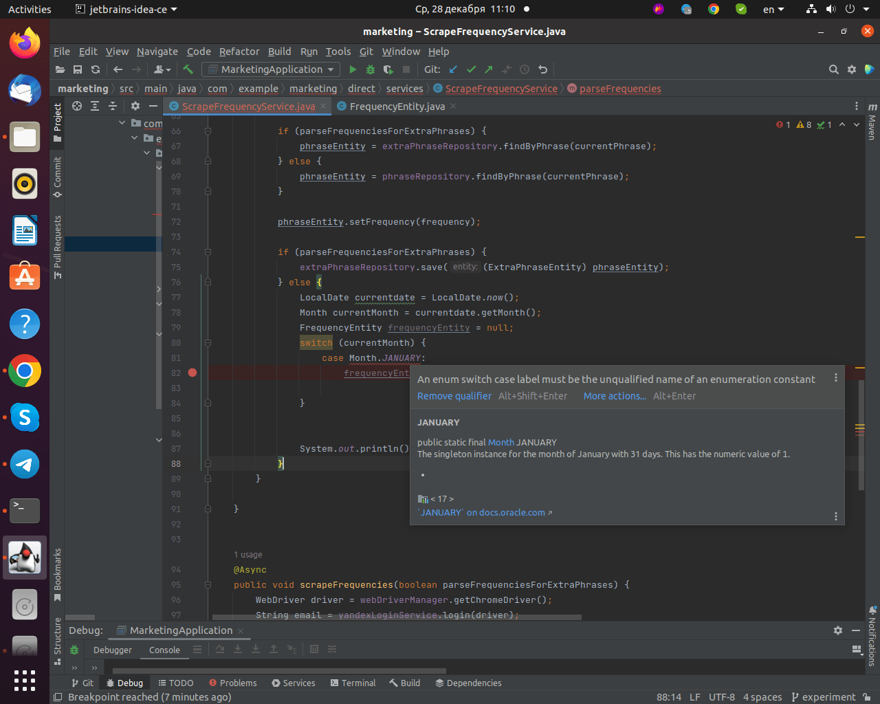 The line I have commented as "Here" causes my IDE to show this: "An enum switch case label must be the unqualified name of an enumeration constant.".