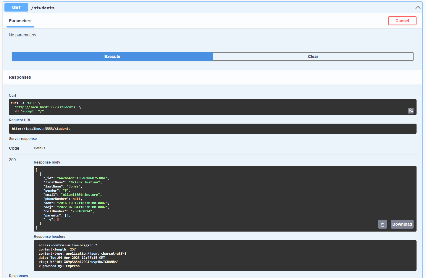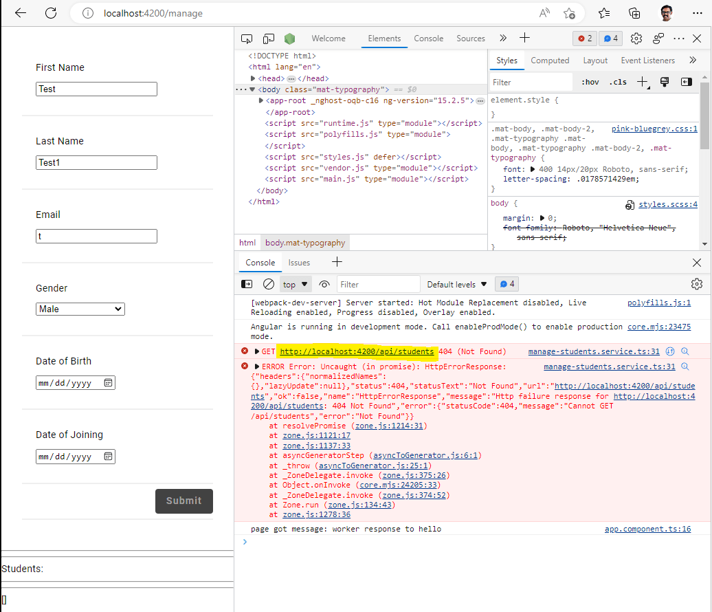 with current config api call will be sent to :3333/api/students while what you want to get is just :3333/students. To achieve such behavior add pathRewrite option to the proxy config