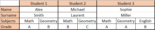 Value for name and surname is always 1, but values for subjects and grade are dynamic (there can be 2 columns or more).
