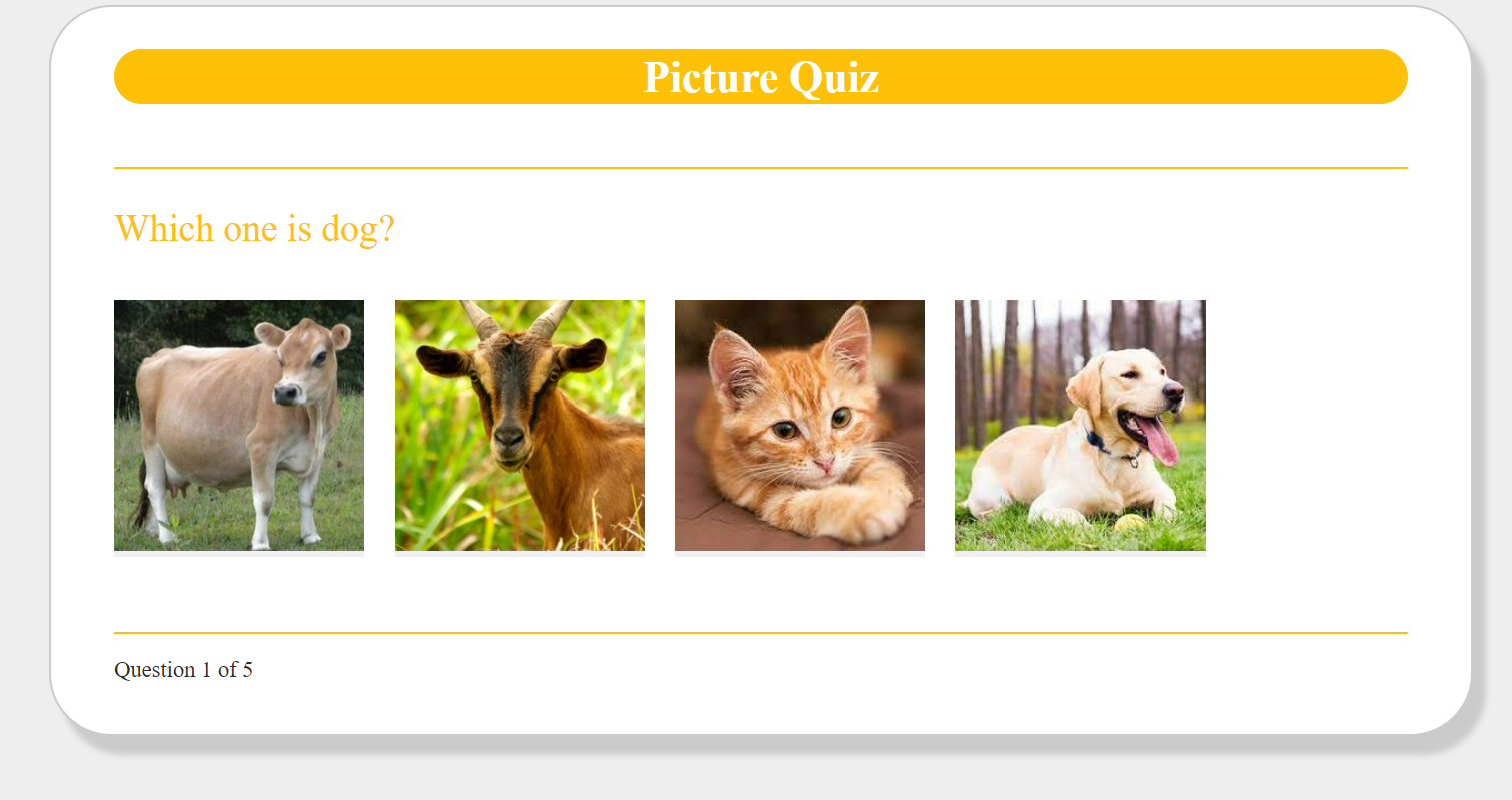 new Question("Which one is dog?", ["cow", "goat", "cat", "dog"], "dog"),
