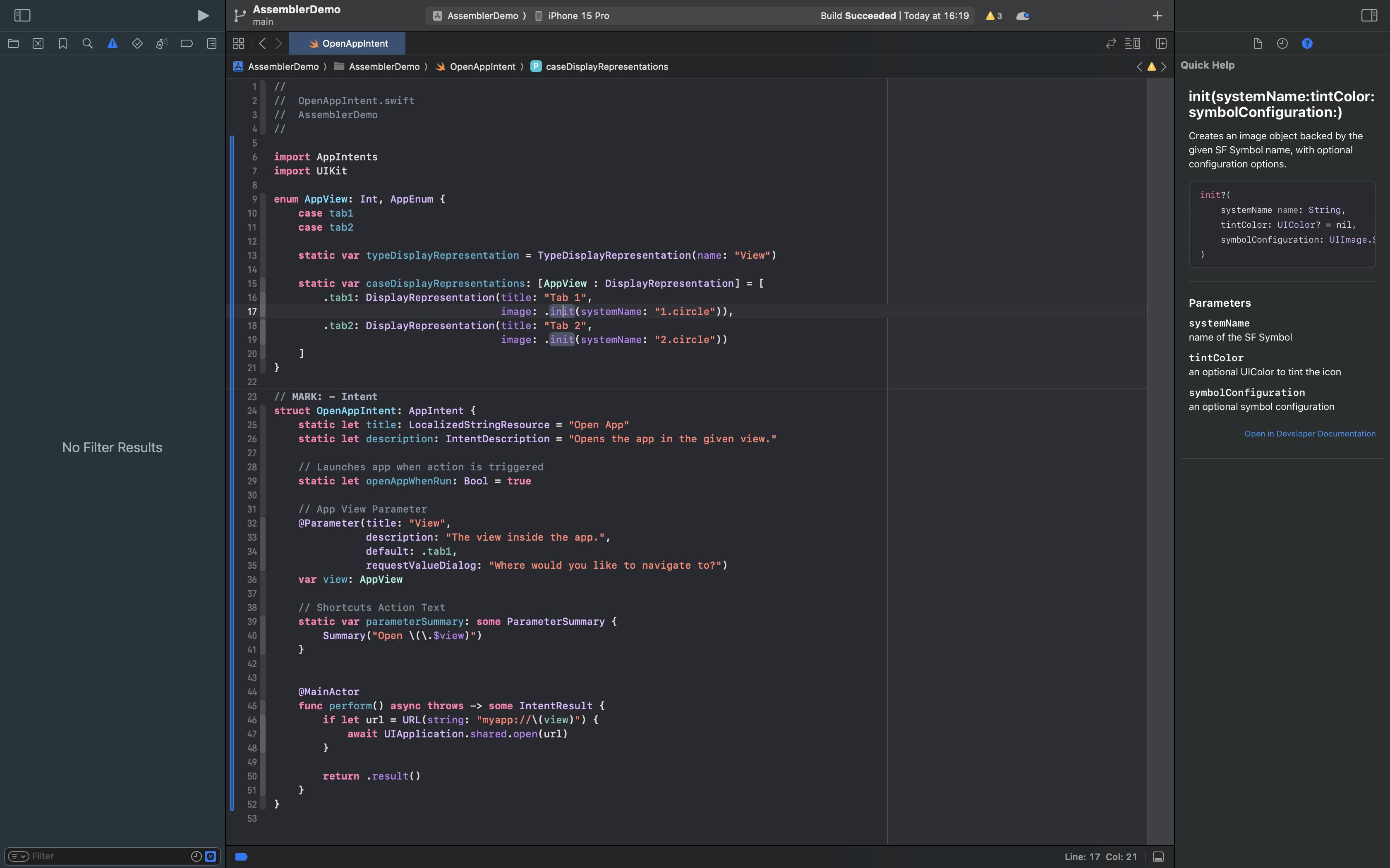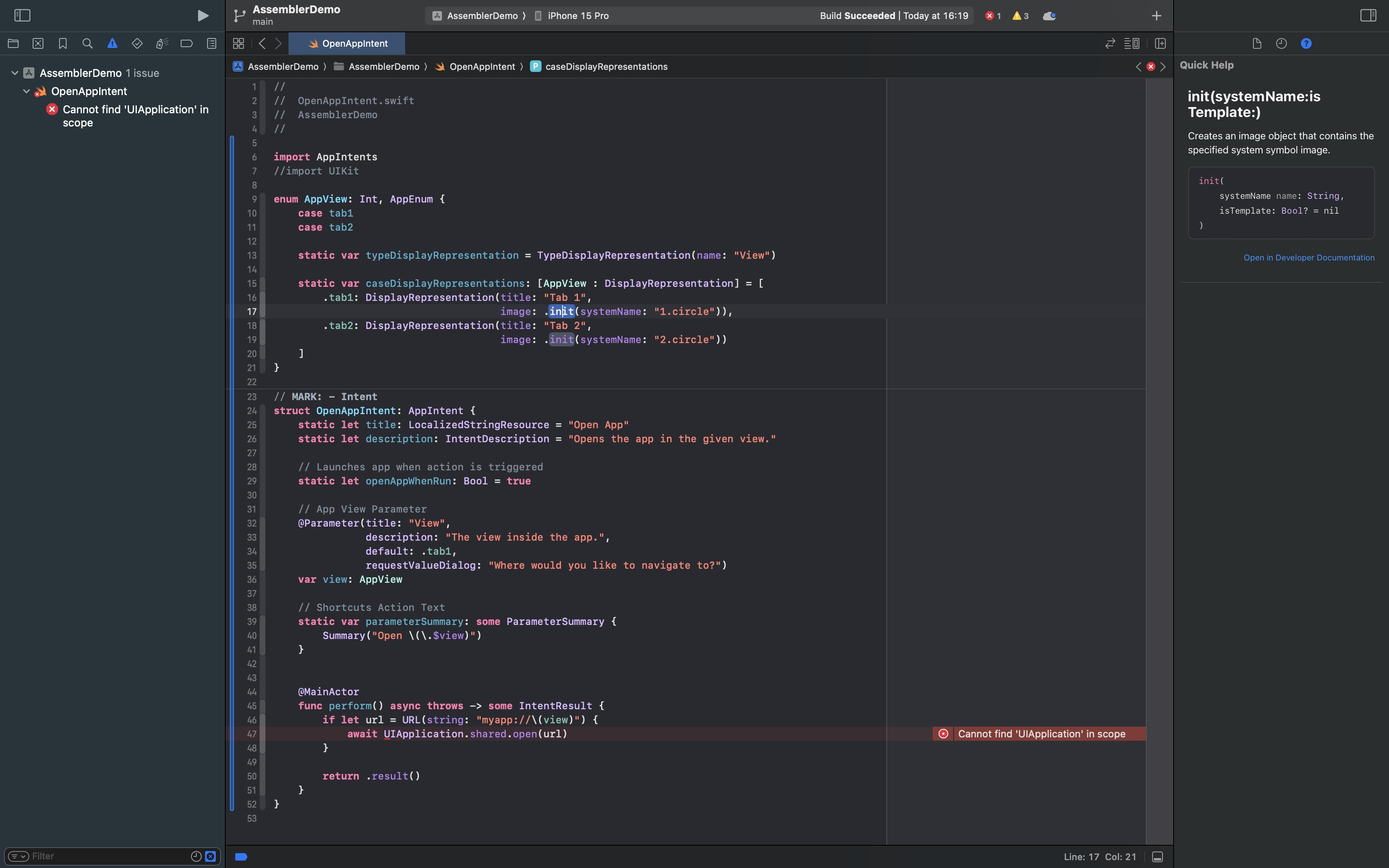 I’m creating a simple AppIntents Shortcut that requires UIKit to open a URL in my app. Though, once I add the import UIKit to my file, Xcode shows me the following warning at the caseDisplayRepresentations, because I use an image for the display repreentations. Without importing UIKit (or without the image for the DisplayRepresentations) everything works fine! Any ideas how to fix that?