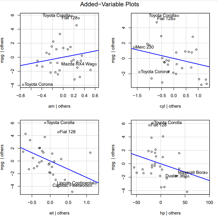 Note: I did not include the terms argument to the car::avPlots() call as the plot includes all the terms by default, but the code runs if you include them.
