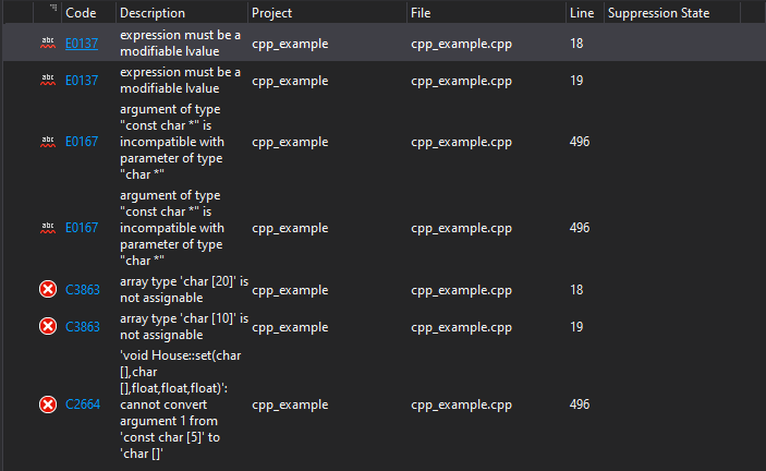 Notice how I made the char array arguments const: that’s because array arguments to functions are really actually pointers in disguise, and you can’t legally assign a literal to a non const pointer (at least not without enabling some kind of compiler specific option to allow dangerous deprecated conversions).