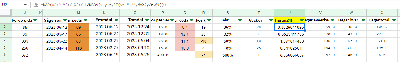 ={"Klar"; ArrayFormula(IF(AND(O2=""),"",IFERROR(MAX((V2)/X2,0))))}