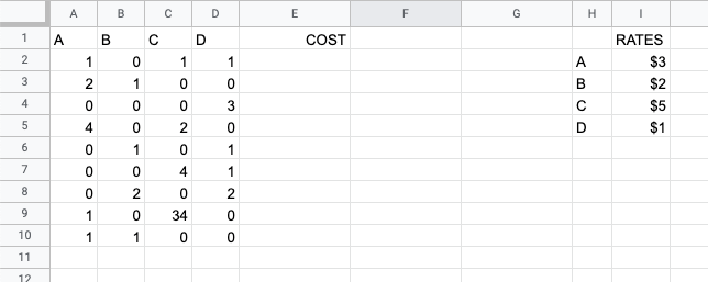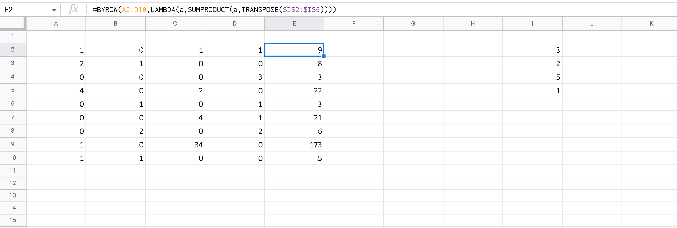 I can easily do =SUMPRODUCT(TRANSPOSE(A2:D2),$I$2:$I$5) for E2 but it’d be more elegant to do an ArrayFormula that does the whole column if possible.