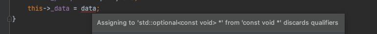 In your example, where _data is a non-const pointer to a std::optional (it doesn’t matter that the std::optional holds a const void type, you’re trying to assign a pointer to a const object (of unknown void type) to a non-const pointer.