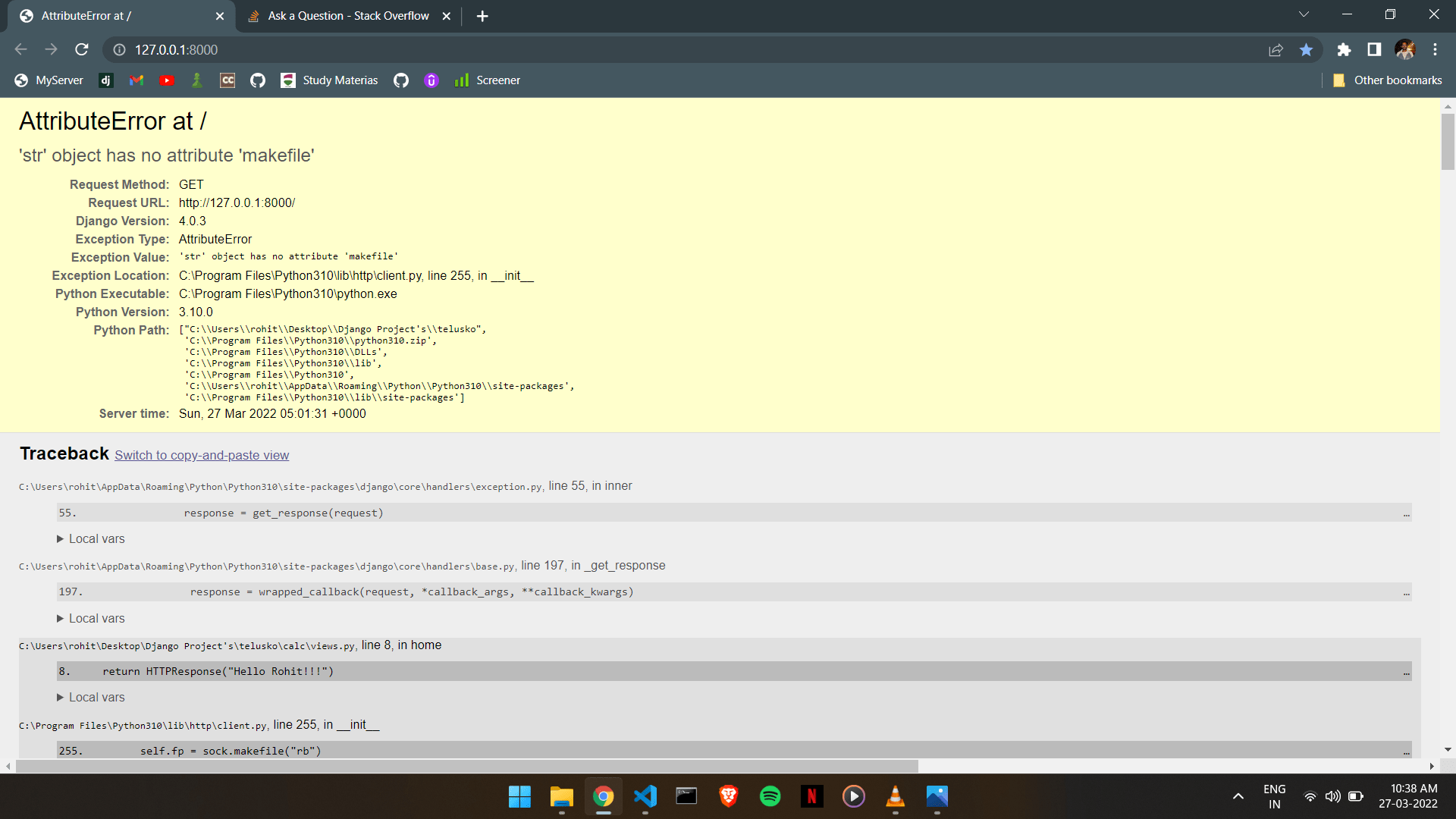 I was trying for just Hello world type of program using Django, everything was perfect but got this error ‘str’ object has no attribute ‘makefile’