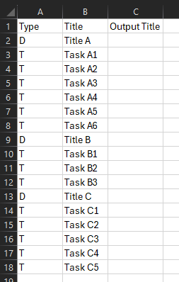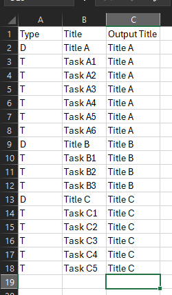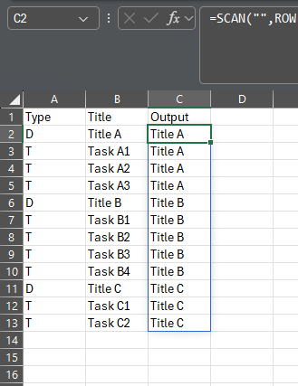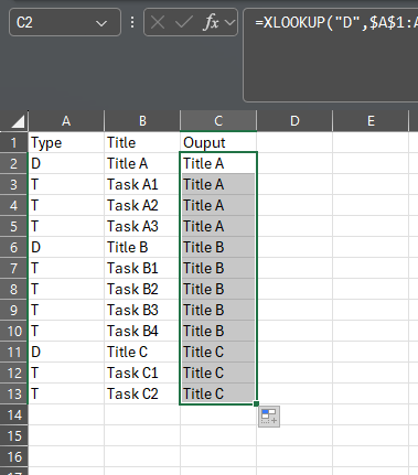 I am attempting to auto fill column C with type column B title, from the nth instance where column A = "D", and to automatically populate the value, until the next occurrence of A = "D", then use the next instance where column A = "D".