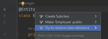 When I place the cursor on @Entity annotation and press ALT+Enter. I don’t find a option to add: