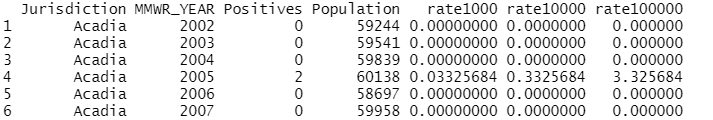 I am trying to find the average rate of a certain virus between 2002-2021, 2002-2012, and 2002-2007 by another variable "jurisdiction". The code I have right now is: