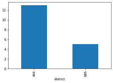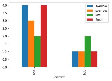 I have a pandas dataframe similar to the following just much larger, what I would like to do is create a bar graph for each district that shows how many birds were present, i.e. how many ‘1’s there are in the column. The ‘1’s stand for ‘was present’, ‘0’ for ‘not present’.