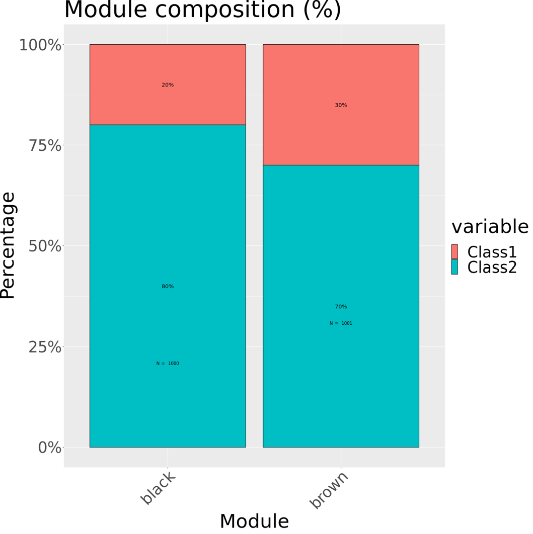 labs(title = "Module composition (%)", y = "Percentage", x = "Module")