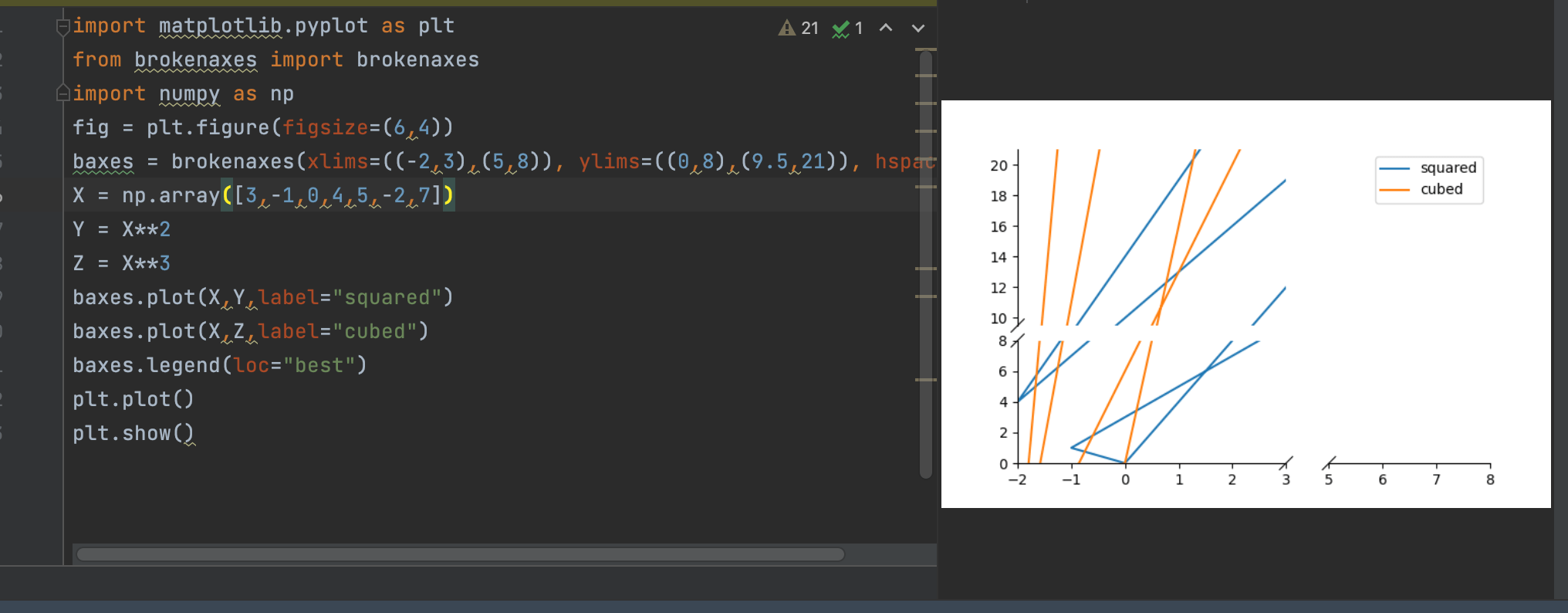 I am trying to use the python brokenaxes to break both x and y axis. I run the code suggested here https://www.codespeedy.com/create-a-plot-with-broken-axis-in-python-using-matplotlib/