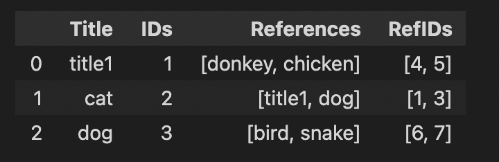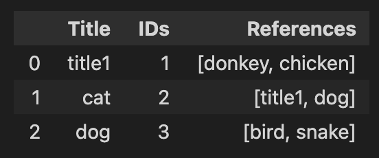 df = pd.DataFrame({'Title': ['title1', 'cat', 'dog'], 'References': [['donkey','chicken'],['title1','dog'],['bird','snake']]})