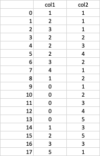 ds = {"col1":[1,2,3,2,2,2,3,4,1,0,0,0,0,0,1,2,3,5]}