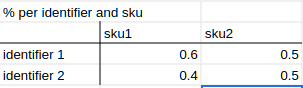 I want to calculate the percentage of each sum per identifier over the total per sku.