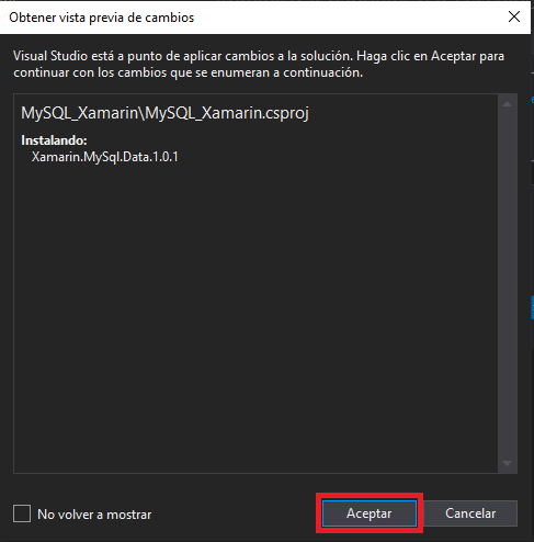 1. Download and install the Xamarin.MySQL.Data plugin.