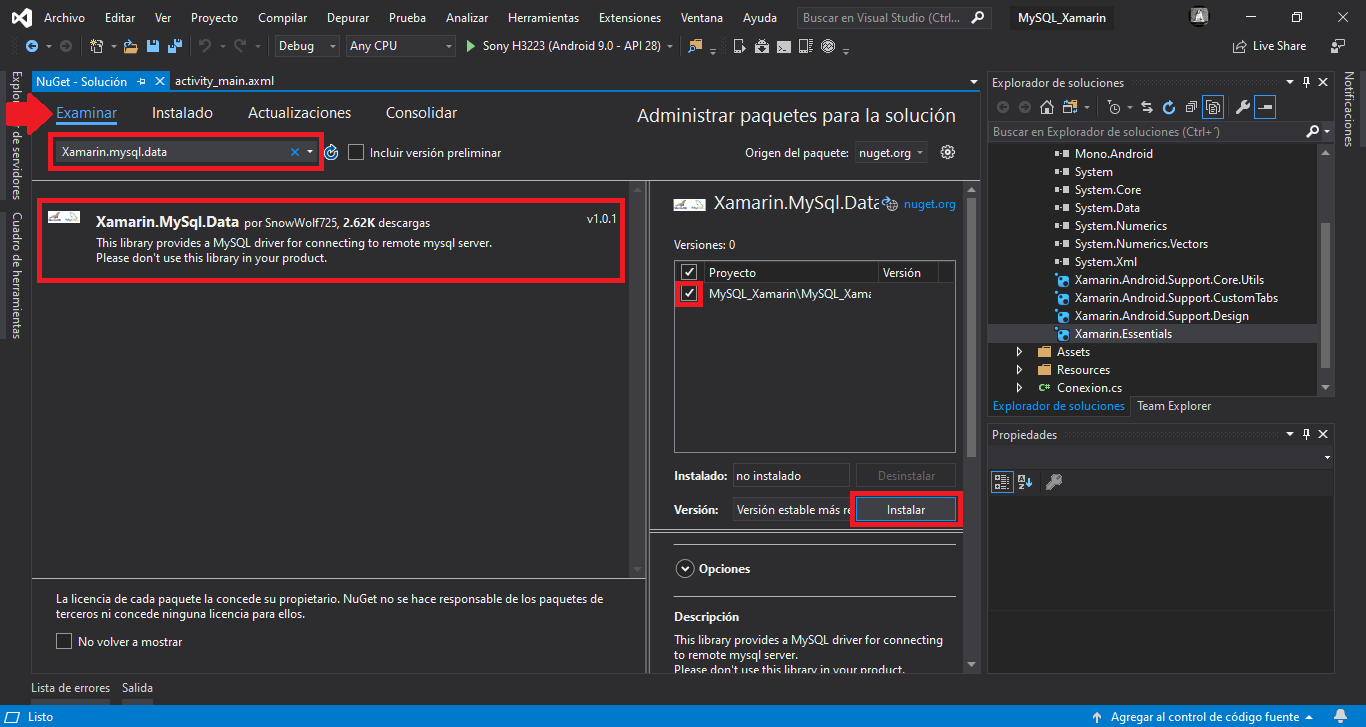 In the window that opens, we change to Browse, there we will look for ‘Xamarin.MySQL.Data’ and we install it in our project (We accept the license).