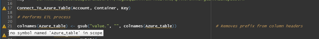 However, while the function executes (and my Azure_table is previewed), I don’t seem to be able to use it in the code to start performing my data transformation. For example, this is the beginning of my ETL function: