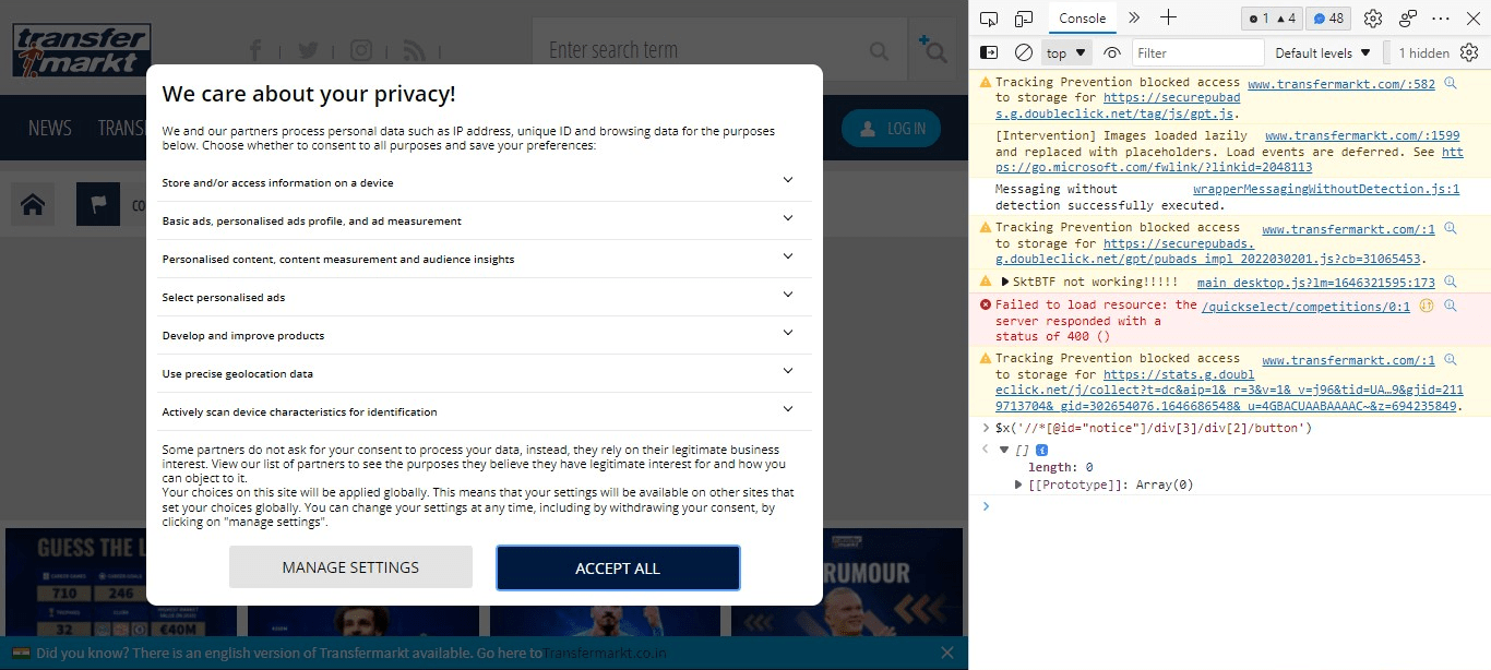 I was using Selenium find_element_by_xpath to click the cookie popup "Accept" button. But it was failing to find the button. So, I tried to locate the button using querySelector in the dev console. Also, the querySelector failed to find the button but after clicking inspect on the button the querySelector able to find the button.