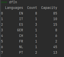 Afterwards, in "dfln", I would also like to add a column which would show the capacity per each language by summing the capacities left of each employee which can speak the language.