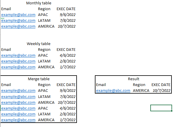 I want to merge these two tables and want distinct email based on latest execution date(ExecDate)
