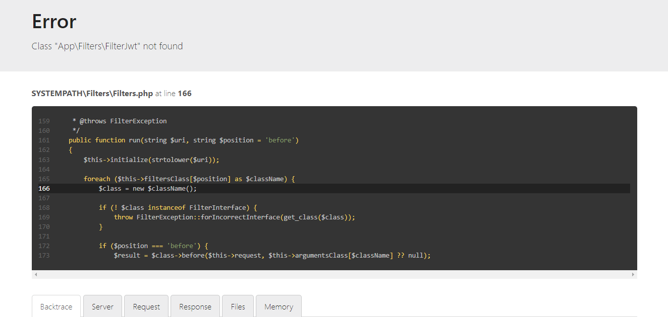 I’m trying to makes a JWT Filter with CI4, but when I about to set my filter in /Config/Filter.php it always says the class is not found although it definitely in the /App/Filters/ directory. I’ve been trying to make new directory in /App and named it AuthFilter still no luck