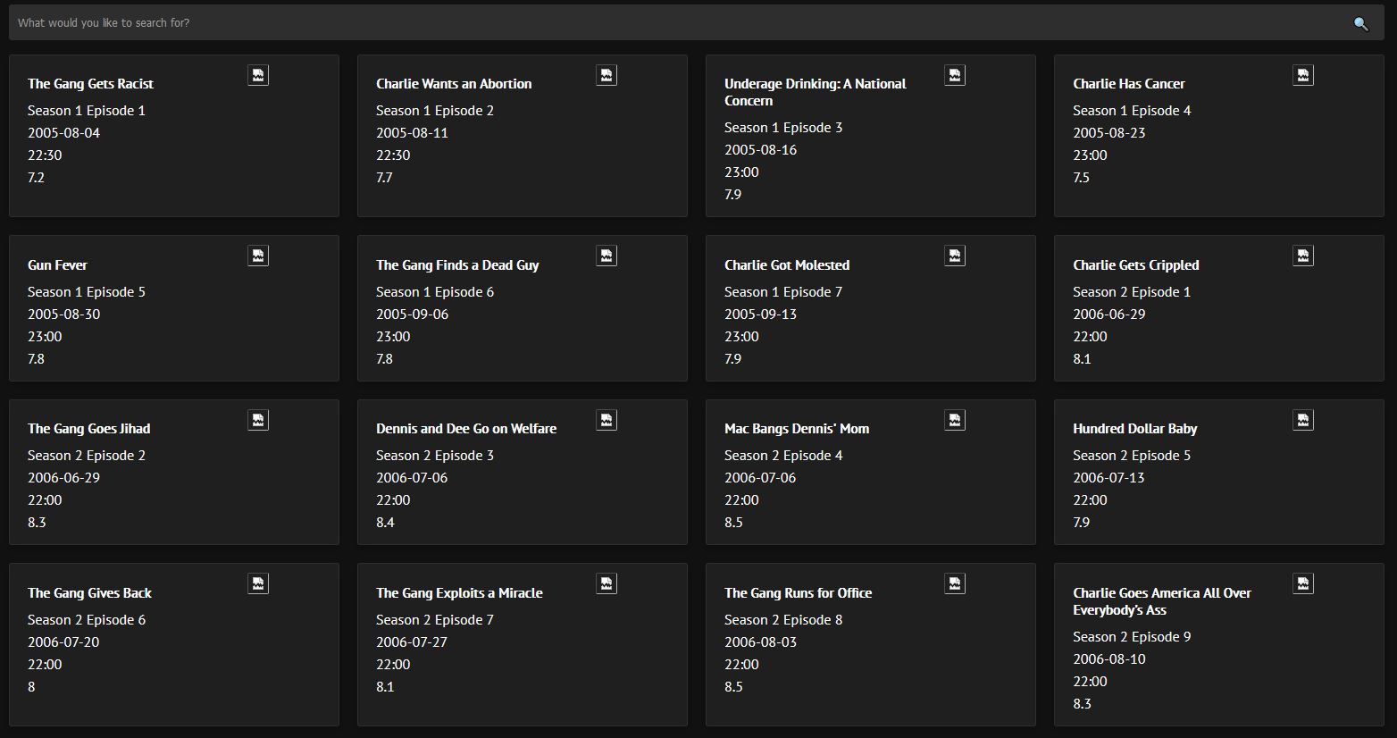 Here is the JS (its pulling the data from here https://api.tvmaze.com/shows/347/episodes):