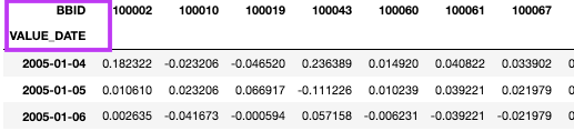 df = df.rename_axis('VALUE_DATE').rename_axis('BBID', axis=1)