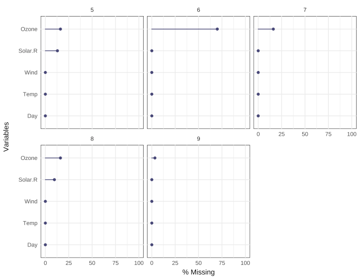 gg_miss_var(airquality, Month, show_pct = TRUE) + ylim(0, 100) +