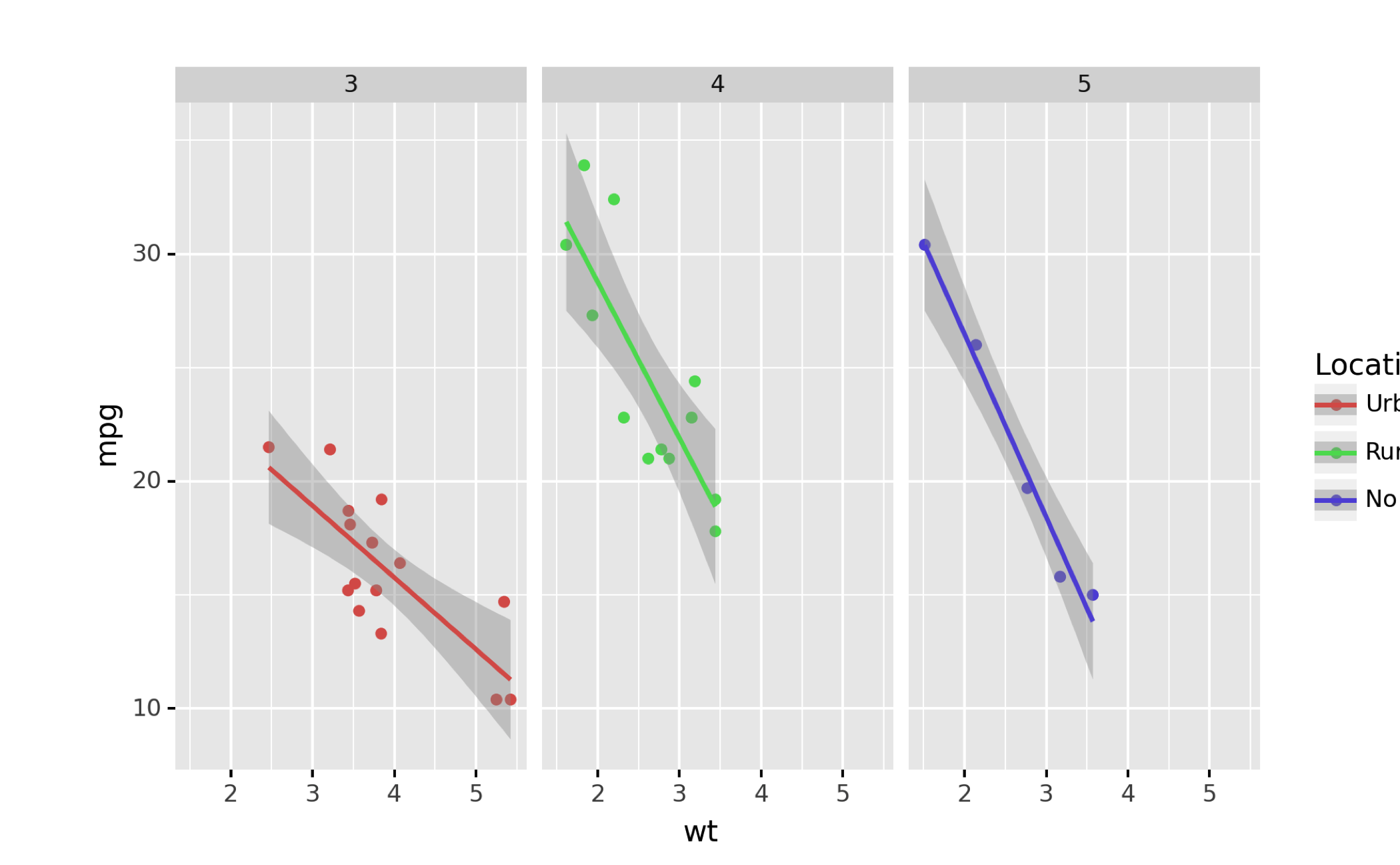from plotnine import ggplot, geom_point, aes, stat_smooth, facet_wrap, scale_color_discrete, labs