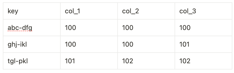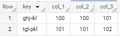 In the example above, it should return the 2nd and 3rd row (with key ghj-ikl and tgl-pkl). All 3 columns have to have the same values.