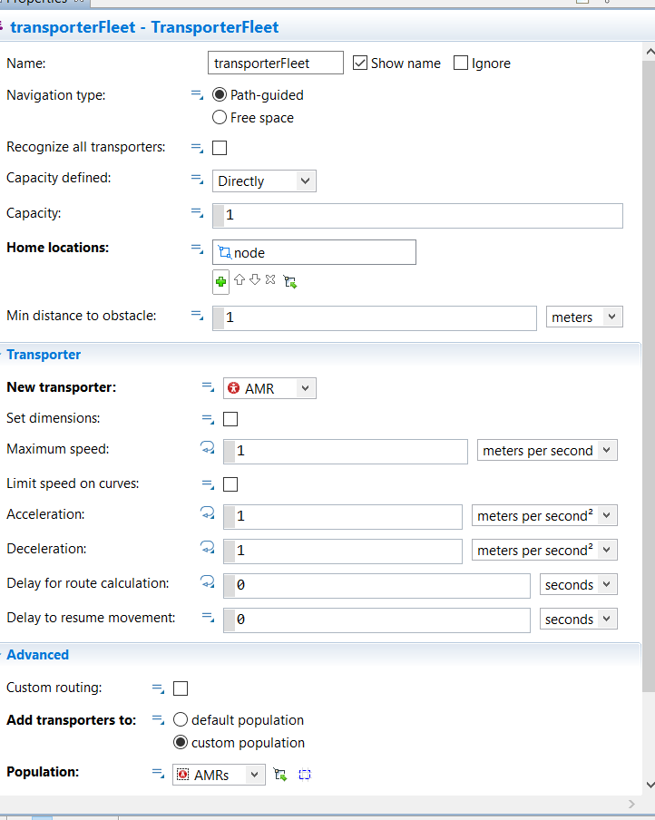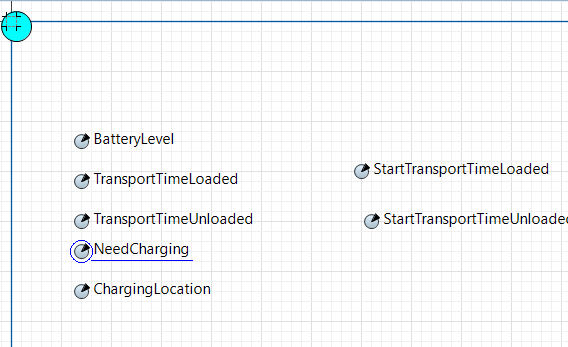 In my model I’ve created an automobile robots(AMR) which transports orders. The Automobile robots is a transporter fleet, which is agent type AMR. This agent type has a parameter which is a boolean for needCharging (see figure 1), during my simulation at a certain point a robot needs to charge and the needCharging parameters changes to true.