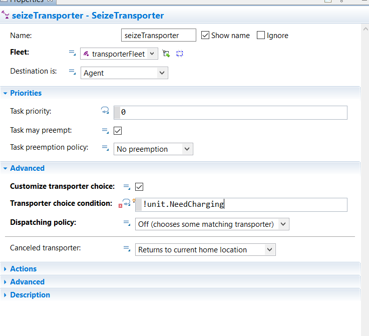 In my model I want when I seize a transporter that he only chooses a transporter in the fleet where NeedCharging==false. So I coded it in the transporter choice condition as !unit.NeedCharging. (see figure 2 and 3 which showing the fleet and seize), but somehow he does not link the unit to a transporter in the seize block, how can I fix this that he only seizes transporters which does not have the parameter needcharging states as true.