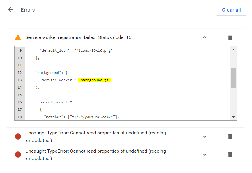 So I am getting started with making a chrome extension. But I’m having this problem where the service worker registration fails and it can’t read properties of undefined.