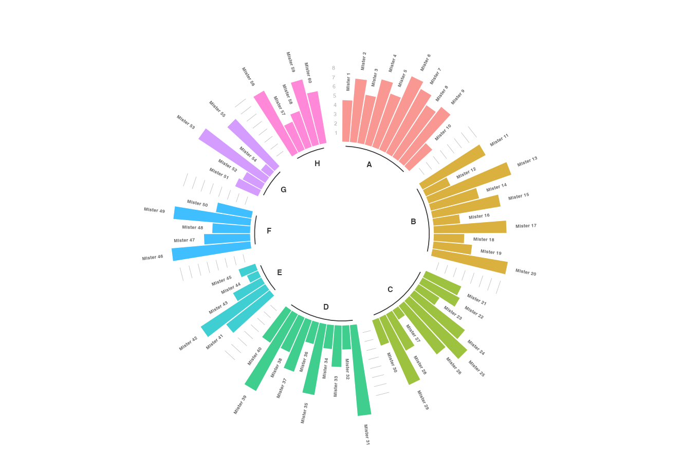I’m trying to reproduce a complex circular bar chart described in this tutorial (Link). However, although the script is adaptable, when I increase the number of groups beyond what is described in the tutorial (from 4 to 8 groups by adding E, F, G and H), I get the following error: “Aesthetics must be either length 1 or the same as the data (8): hjust”.