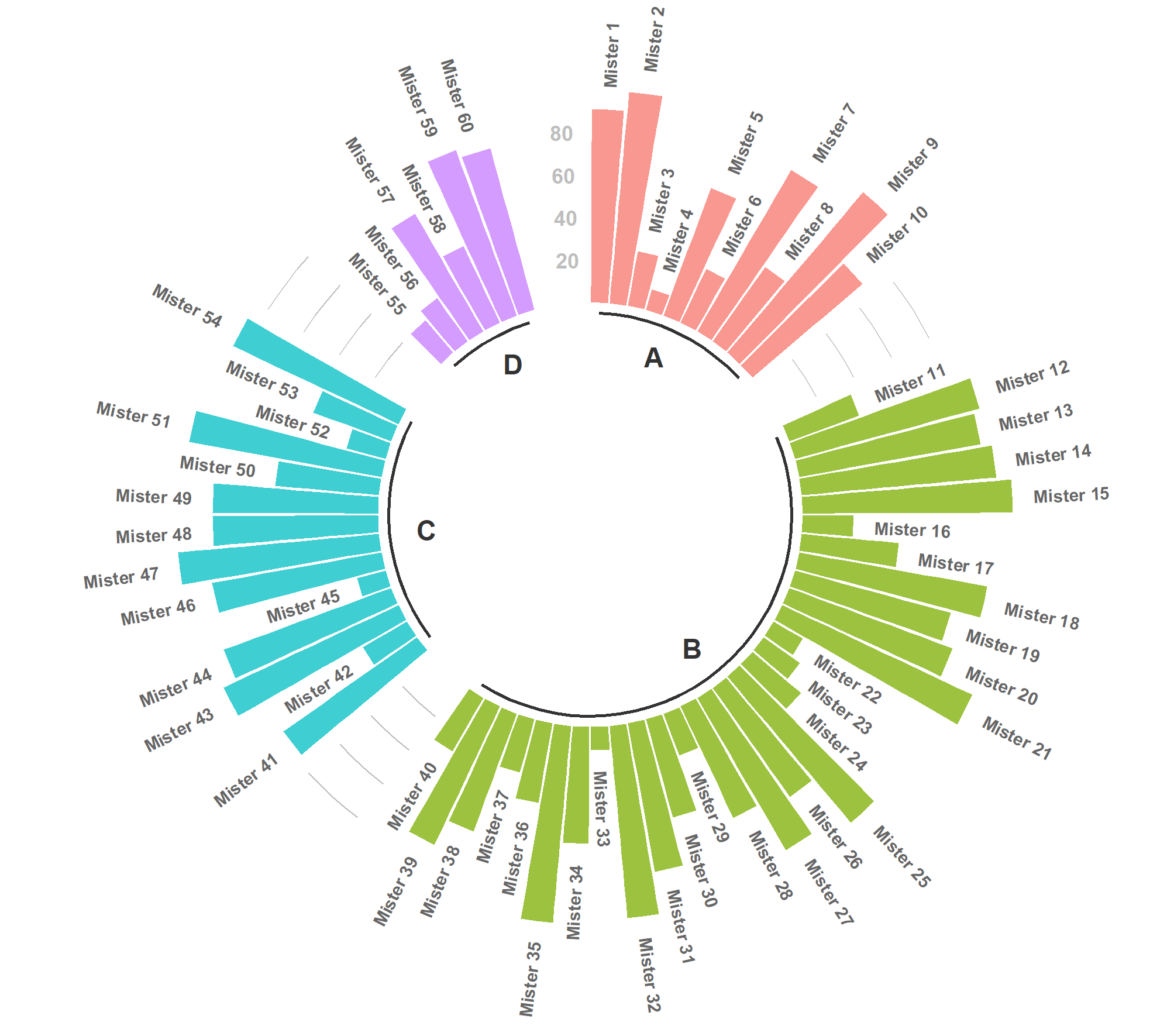 annotate("text", x = rep(max(data$id),4), y = c(20, 40, 60, 80), label = c("20", "40", "60", "80") , color="grey", size=3 , angle=0, fontface="bold", hjust=1) +