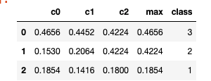 I have a dataframe which is very big. I don’t want to iterate over each row. I want to classify them based on the maximum of each row. If the values is greater than 0.45 is in class 3, if<0.2 in class 1, if >0.45 in class 3. Here is a sample of the dataframe: