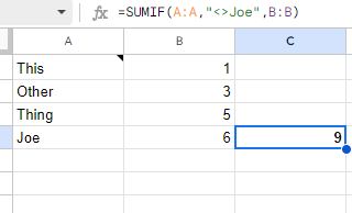 I want to get the sum of B,D where A,C does not equal Joe…basically get everyone’s hours except Joes.