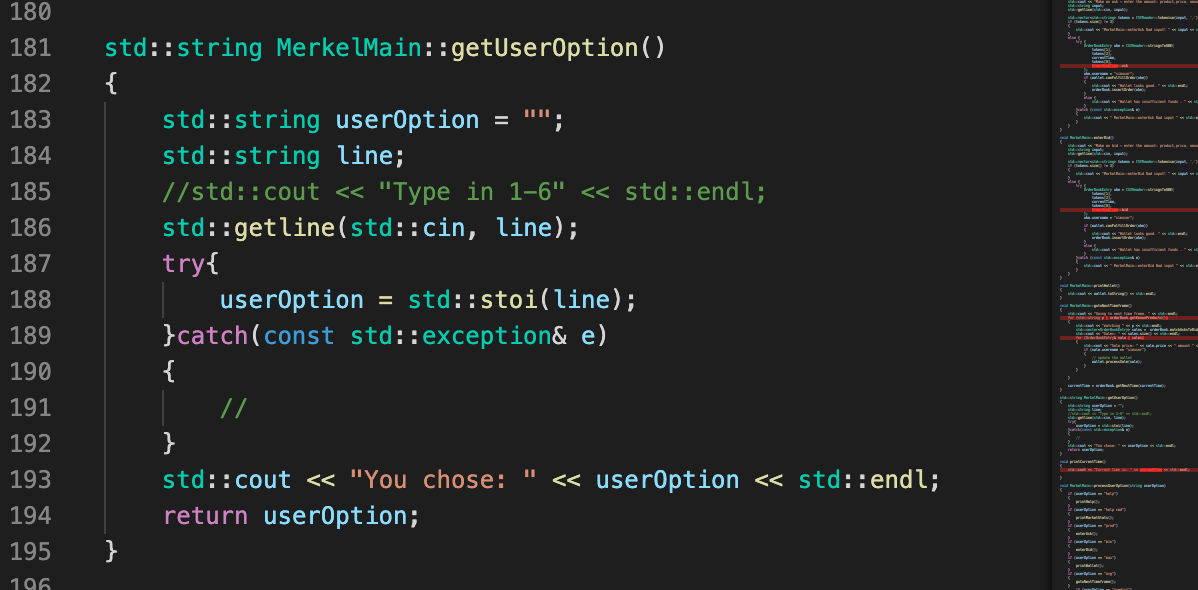 For my assignment, we were given some starter code that simulates a command-line crypto trading platform. Originally, you would be prompted to type in commands 1 to 6 to do things like print exchange stats, make an offer, print the wallet and such. For my assignment, I’ve been asked to create an advisor bot that takes in string commands such as ‘help’ and processes this to return the appropriate output.