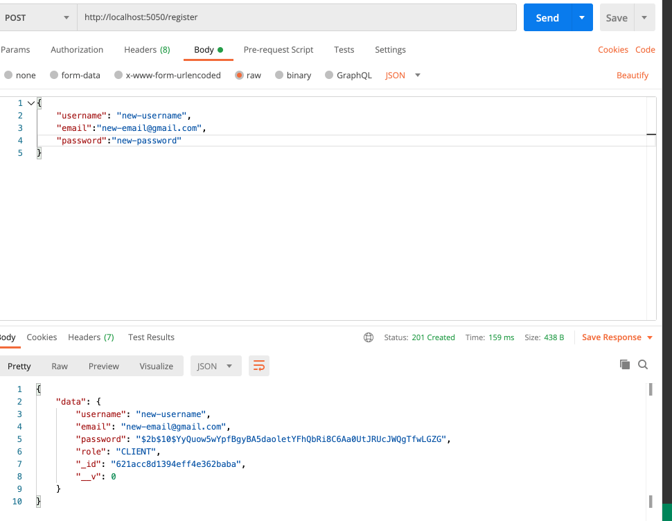 Finally, here is a screenshot of Postman, where I am able to test my API requests and you can see that I am able to get the correct output back of a user being successfully registered. Once this is successful, the new user is added to my MongoDB database.