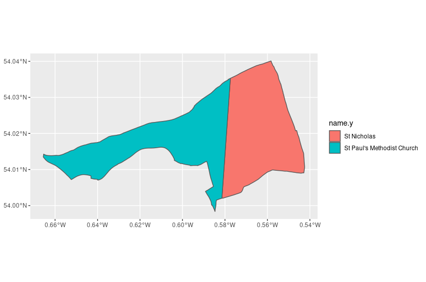 For this example, I am trying to color the map of the UK village of Wetwang based on proximity to one of the two churches in the village. Here is the code for the basic plot without Voronoi diagrams, which shows the polygon of the village and the two churches as points.